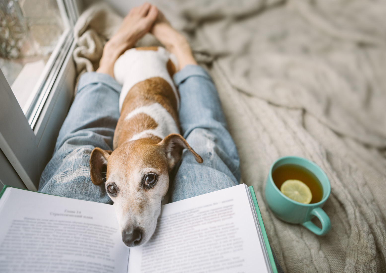 Gemütlich zu Hause lesen – mit Jack Russell, heißem Tee und einem guten Buch. Entspannte Wochenendstimmung in Beige und Blau.