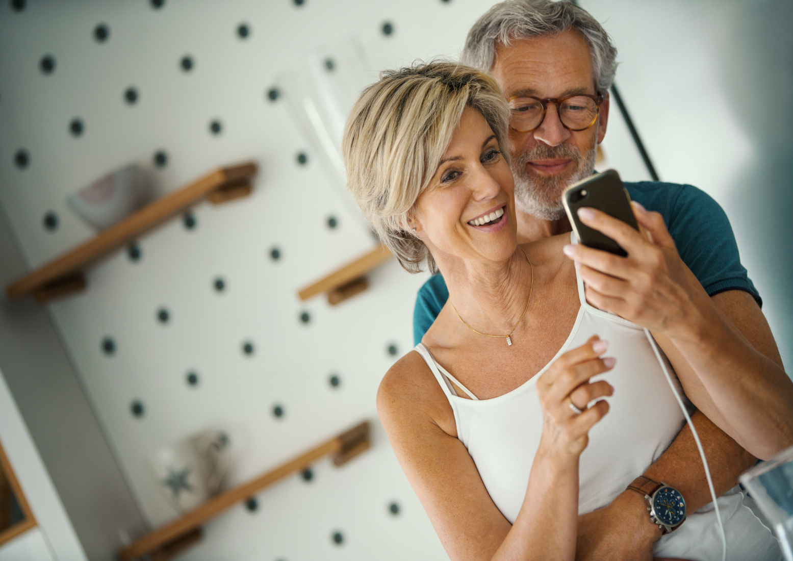 Closeup front view of a mid 50’s couple staying at home during coronavirus quarantine. They are sitting in the living room and making video calls to family and friends.