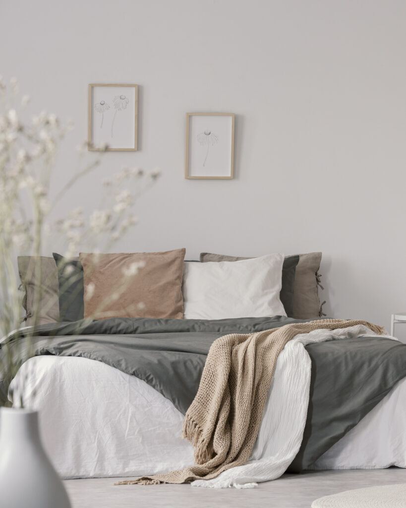 Wooden armchair next to bed with blanket and cushions in white bedroom interior. Real photo